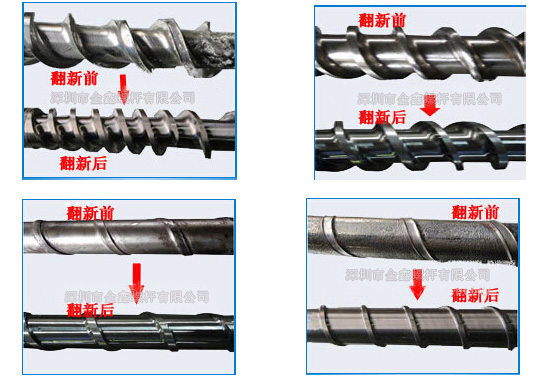 生產過程中,出現產量下降,壓力降低,塑化變差等等情況,那是因為螺桿機筒磨損了,配合間隙變大而導致的。在這種情況下就需要翻新修復螺桿機筒或者更換新的螺桿機筒了;為了降低成本,很多客戶都選擇翻新修復螺桿機筒,根據客戶實際生產用料情況(有無加纖,填充,再生料等等),一套螺桿機筒可翻新1-2次。幾乎所有的塑膠機械螺桿機筒都可以翻新修復。